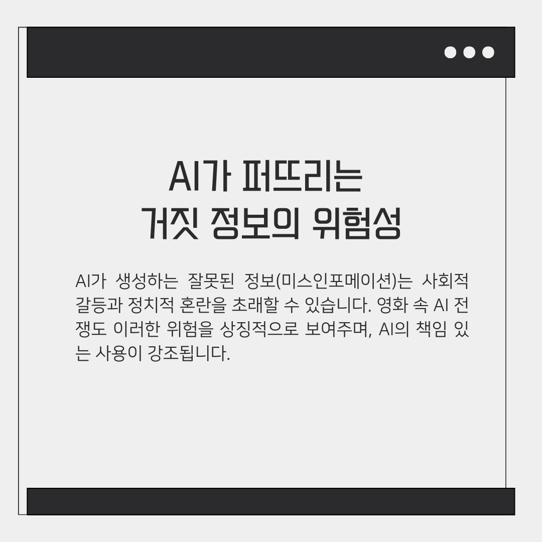 AI의 발전은 긍정적인 면뿐만 아니라 심각한 위험도 내포하고 있습니다. 가장 큰 문제 중 하나는 AI가 퍼뜨리는 잘못된 정보(미스인포메이션)입니다. 이는 사회적 갈등을 심화시키고 정치적 혼란을 야기할 가능성이 있습니다.